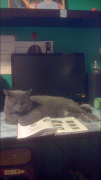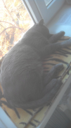 Крупного размера.Окрас серый. На животе белое пятнышко. Зеленые глаза. Ласковый.Ему 7 лет . Хвост не пушистый и немного в полоску.У него толстые щечки.